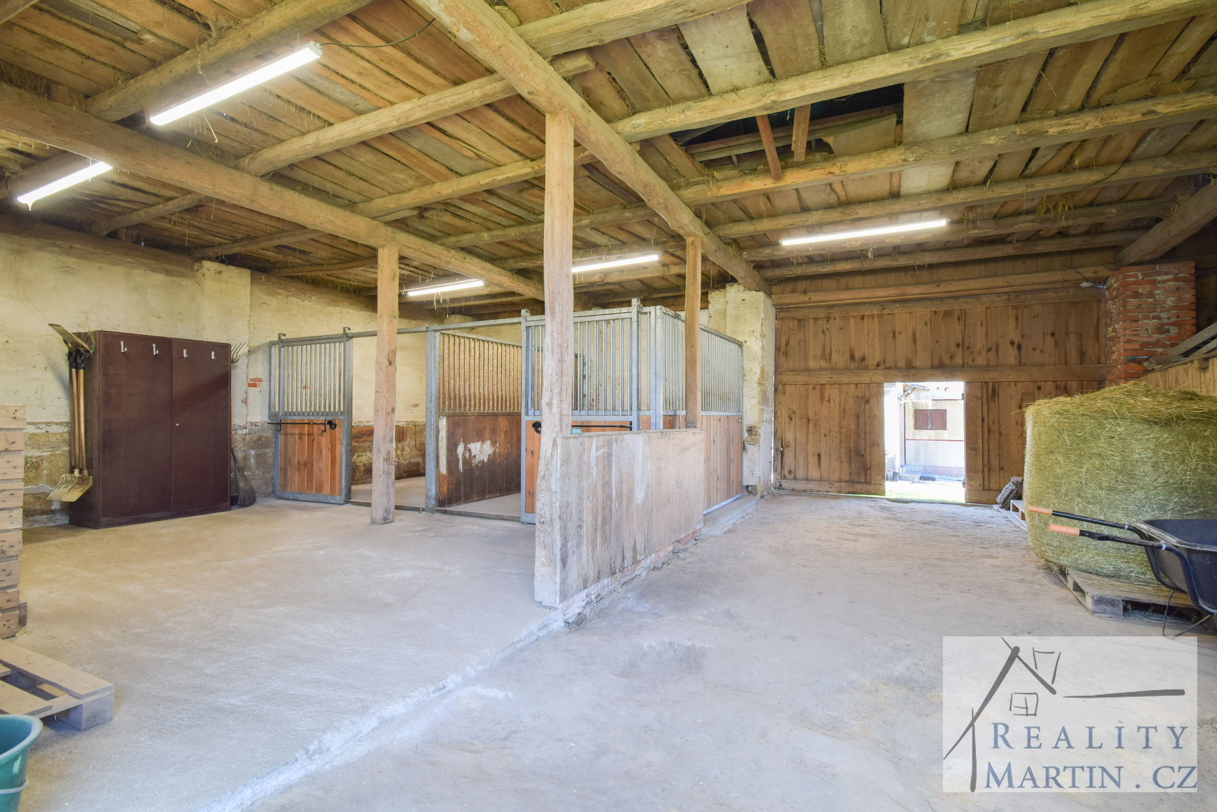 Stodola 84 m, 2 x box pro koně s gumovou podlahou 3,6m x 2,75m, kolna 23,5 m2, garáž 20 m2. Napájení koní v boxech řešeno vědry.
